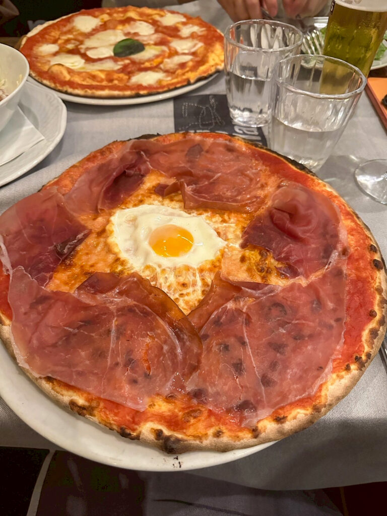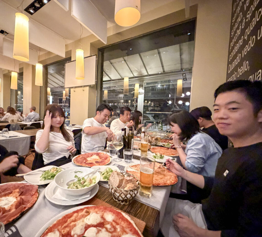全体行動後の夕食は自由時間となっていたため、有志を募って一緒に食べに行くことに。ホテルのフロントでおすすめのピザ屋さんを紹介してもらい、総勢10人で向かいました。ここでハプニングが発生。シェア文化が根付く日本と違い、イタリアでは基本的に一人一品注文が原則。例に漏れず、訪れたお店でも各自1品ずつ頼むことになりました。