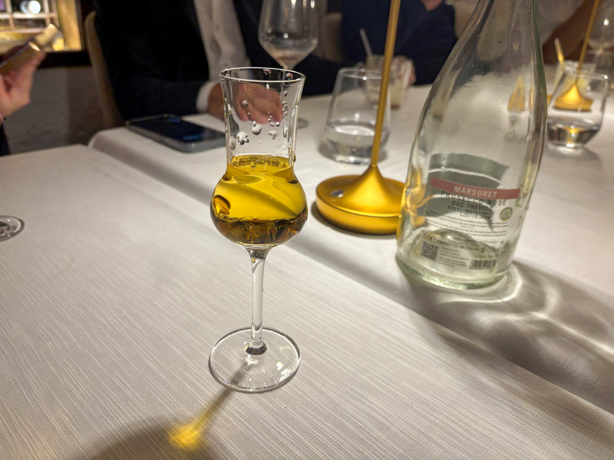 そして、もうひとつ紹介したいお酒が「グラッパ」です。2度いただきましたが、一言で表すなら「強いスピリット!」。ワインを造る際に残るブドウの搾りかすを蒸留して作られる、イタリアの食後酒です。アルコール度数は40~60%と高めで、ゆっくり味わうのが本来の飲み方だと思いますが、私たちはショットグラスで一気に飲み干し、喉が焼けるような感覚を体験しました。しかし飲み終わると驚くほどすっきりとして、食後の重さがすっと消える感じ。日本でもサイゼリヤで楽しめるそうなので、機会があればまた味わいたい一杯です。