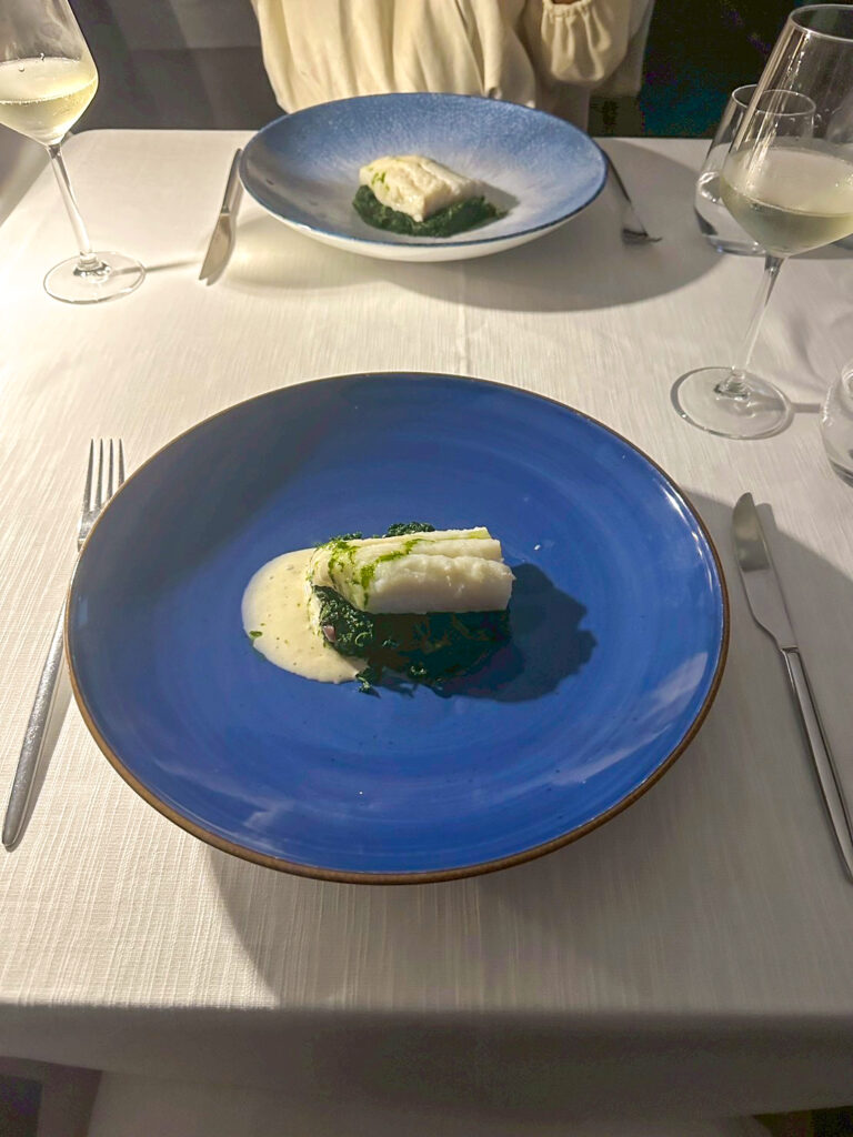 郷土料理なのかどうかや、イタリア語での名前は不明ですが、魚はとにかくふわふわ。ソースはクリームベースに塩とニンニクがほどよく加えられており、1品目のパスタの後でも最後までおいしくいただけました。下に敷かれたほうれん草も含め、日本人なら間違いなく好きだと感じる懐かしい味わいの一皿でした。