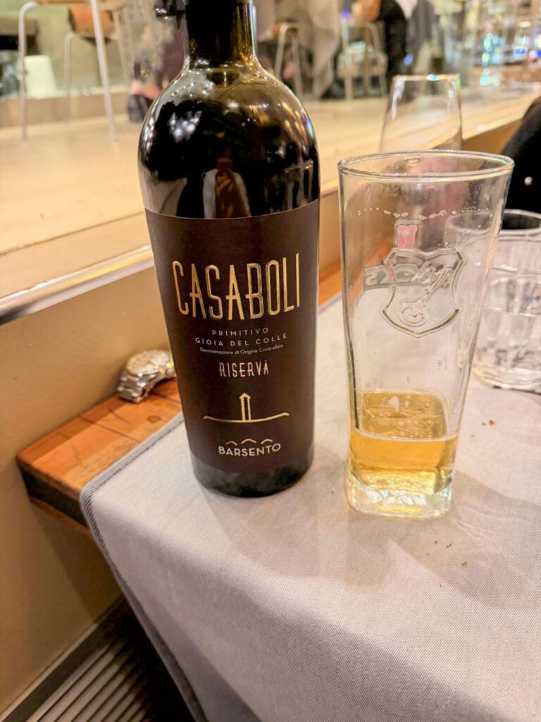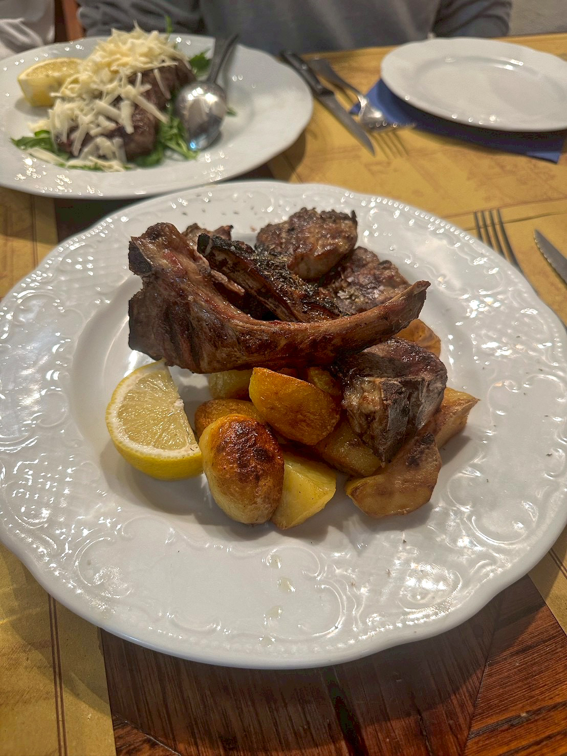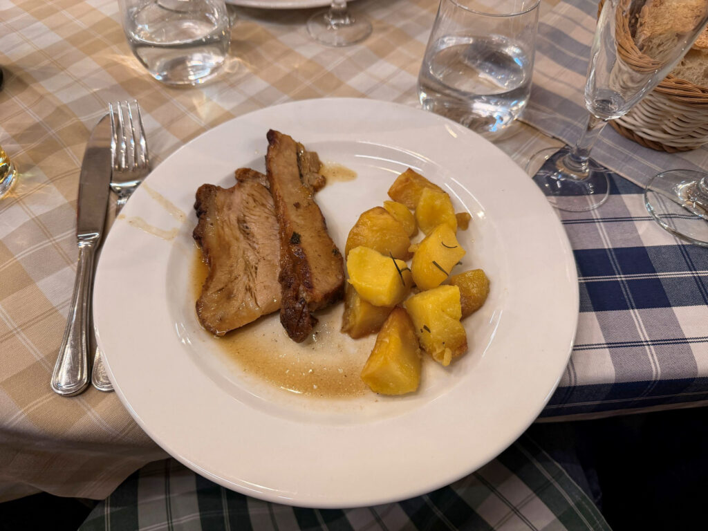 イタリア語で「豚の丸焼き」を意味する伝統料理で、これも事前に調べて狙っていた料理のひとつです。一見ただのローストポークですが、一口食べると日本とはまったく違う味付けに驚きます。イタリアならではのスパイスやハーブが複雑で奥深い香りを生み、豚肉本来の甘みと脂の旨味がじんわりと広がる……。恐らくニンニクやローズマリーなどが使われているのだと思いますが、飽きずに食べられる絶妙なバランスの一皿でした。