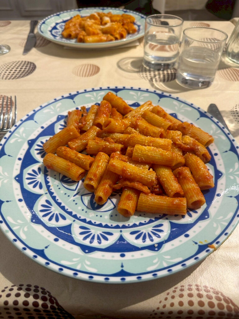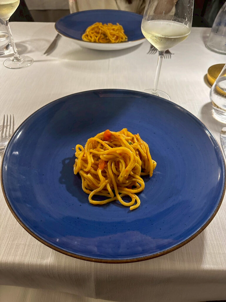 正確な名前は不明ですが、このイタリア旅行で食べたパスタの中で最も美味しく感じた一皿でした。麺はスパゲッティより幅広で、モチっとした弾力のある食感は、どこか日本のラーメンを思わせる親近感と懐かしさがあります。濃厚なトマトソースが麺によく絡み、馴染み深いツナがどこか家庭料理の安心感を与えてくれます。恐らくオリーブオイルやニンニクも使われており、皆さん口々に「ボーノ」とつぶやきながら楽しんでいました。旅の締めくくりにふさわしい一皿です。