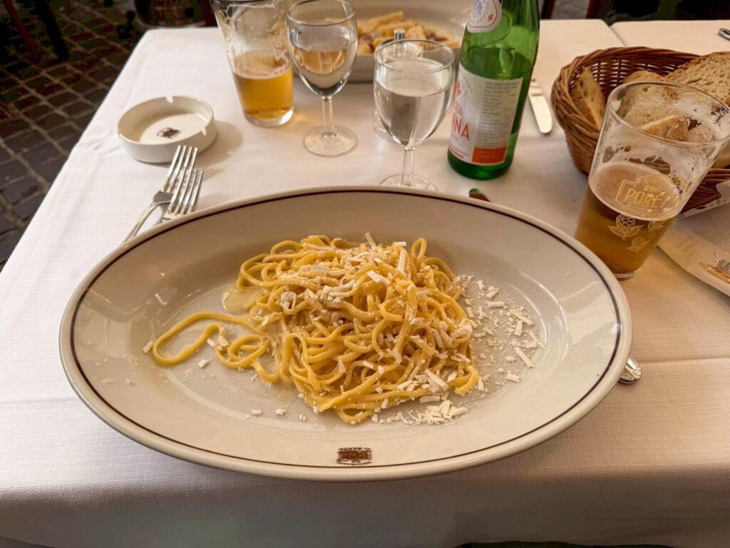 出発前から食べ物については念入りに調べており、その中でも特に食べたいと思っていたのが「カチョ・エ・ペペ」でした。まさか到着して最初のランチで、早くもお目当ての一皿に出会えるとは思いもしません。