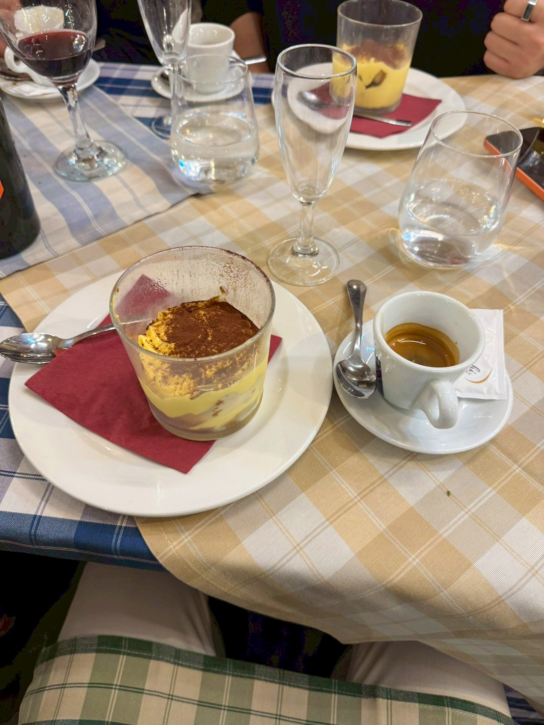 3品目は「ティラミスとエスプレッソ」。甘党でティラミスにもうるさい私ですが、これは文句なしのおいしさ。カスタードクリームの甘さに油断した瞬間、カップ下段に隠れていたエスプレッソがしみ込んだ苦みのある生地が登場し、そのコントラストが最高でした。エスプレッソ自体も、ティラミスの甘さや食事の後味をすっと洗い流してくれる、本場ならではのキレのある味でした。