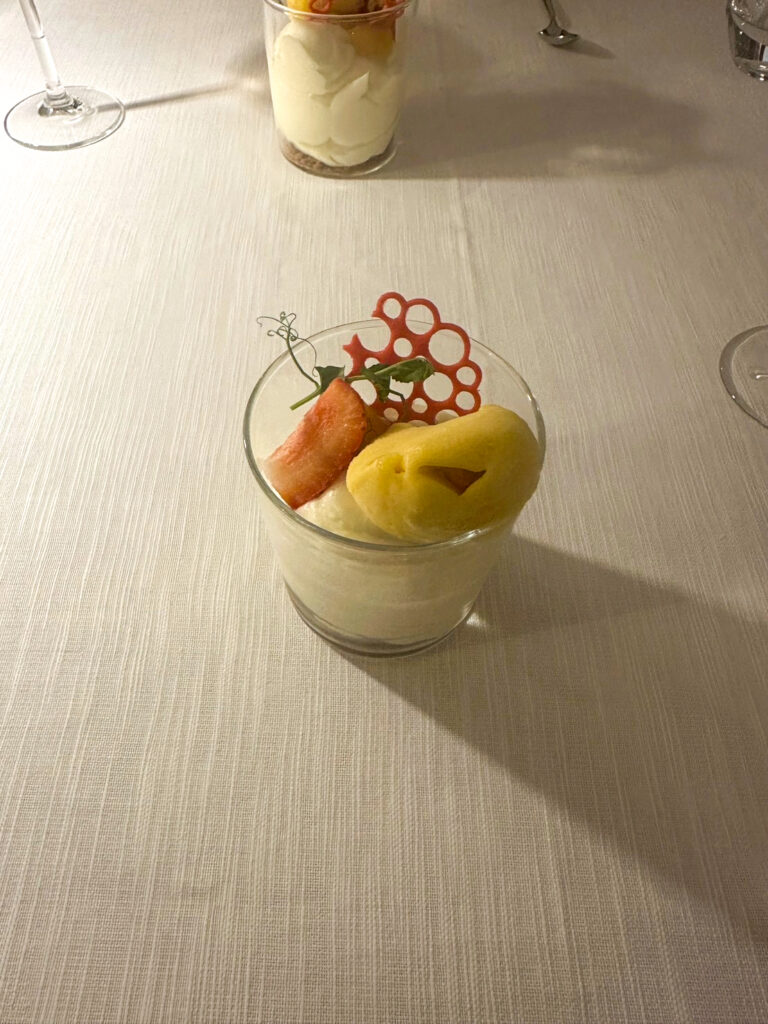 3品目はデザート。ジェラートとアイスクリーム、いちごが添えられた一皿で、口当たりさっぱり。甘さ控えめで最後まで美味しく楽しめました。