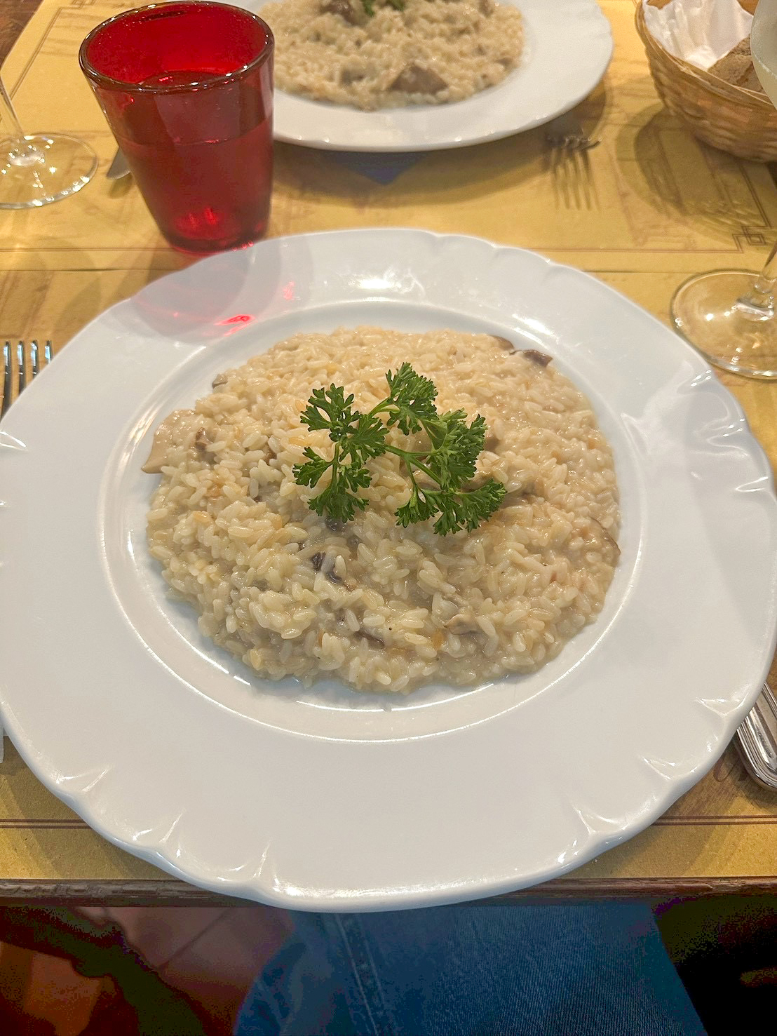 1品目は「ポルチーニ茸のリゾット」でした。麺というか小麦粉に若干の飽きを感じていたため、日本人になじみ深いお米を食べることに。ポルチーニ茸は世界三大キノコのひとつで特有の深く豊かな森の香りが食欲をそそります。一口食べると肉厚なキノコの触感と風味が口いっぱいに広がりおいしい!またクリーミーだけどお米の芯がわずかに残ったアルデンテの歯ごたえが癖になります。ポルチーニの旨味がシンプルながらも深い味わいの一皿でした。