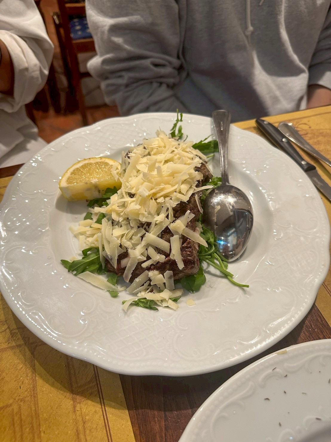 3日目は1日自由行動のためフィレンツェへ向かいました。朝5時半の出発だったため朝食はマクドナルドのカフェラテのみ。味はとてもおいしかったのですが、お昼ごろになるとやはりお腹がすいてきました。フィレンツェの郷土料理もたくさんあるのですが、しっかりとしたお肉を食べていないということで、メインを肉料理に絞ったレストラン探しをして、評価の高い場所でいただいた3品です。