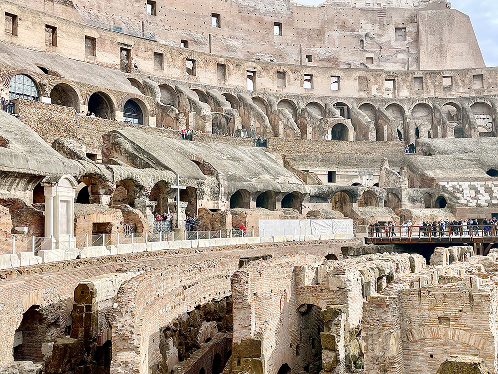 例えばコロッセオの階段は、最上階に近づくにつれ勾配が急になり狭くなります。これは、当時低層フロアは階級が高い人の観戦エリアだったため、その人達がスムーズに退場できるように意図して設計されているからだそうです。