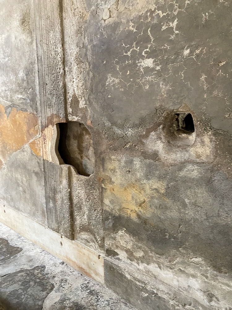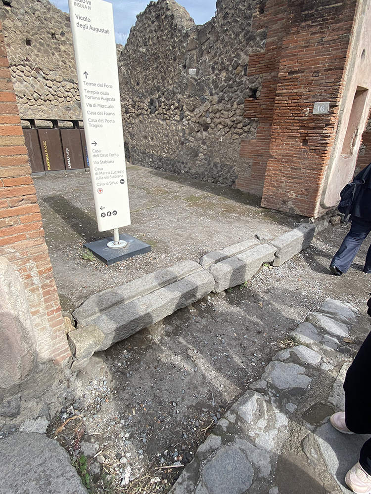 ほかにも、歯医者・床屋・洗濯屋・酒屋など様々なサービスを提供する店が揃っていました。 そういった店のあった場所の入口には石に窪んだ跡があり、そこに引き戸が使われていたことが分かります。