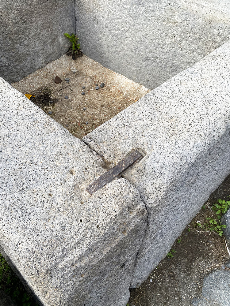 水場につける馬車がぶつかっても壊れにくいよう大きな石を角に置き、石同士をつなげるために「かすがい」が用いられています。「かすがい」は木材同士を接合させるための金物として現代でも使われています。