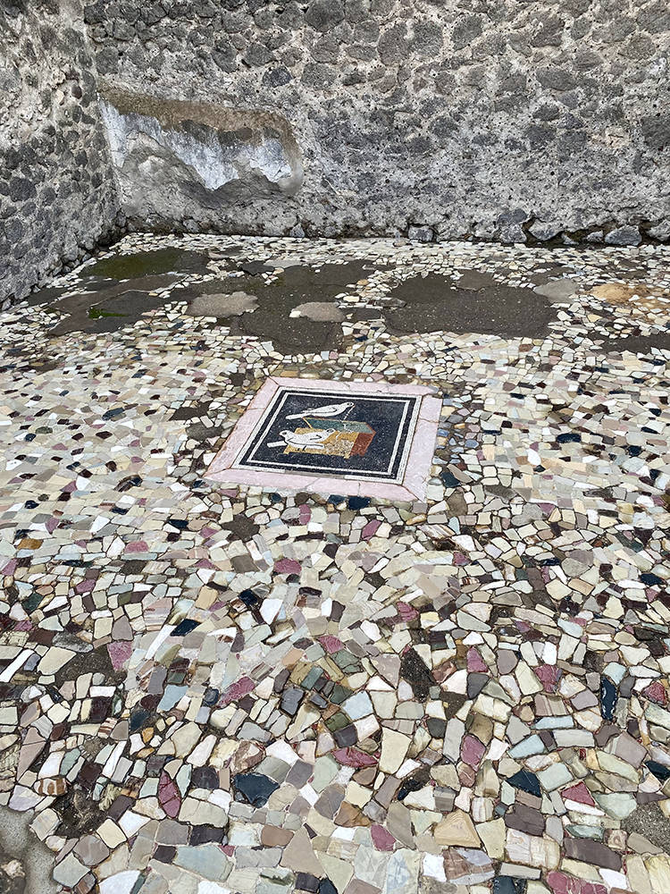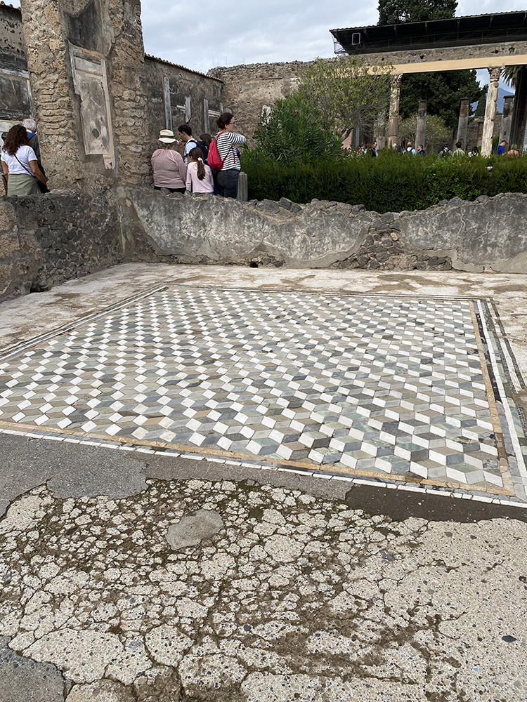 現代のタイル工事は、主にタイルを工場で製作して現場に運びますが、当時はテッセラ(小石の破片)を手でカットして敷き詰めて作ったそうです。 手間と時間がかけられたこのタイルの上を歩いて生活していたとは、贅沢ですね。