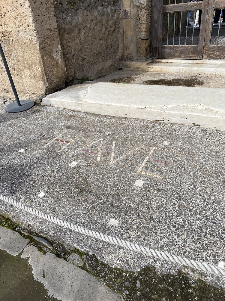 有名なスポットとなっている「猛犬に注意(CAVE CANEM)」のモザイクタイル。他にも様々な住宅の中にモザイクタイルが施されていました。
