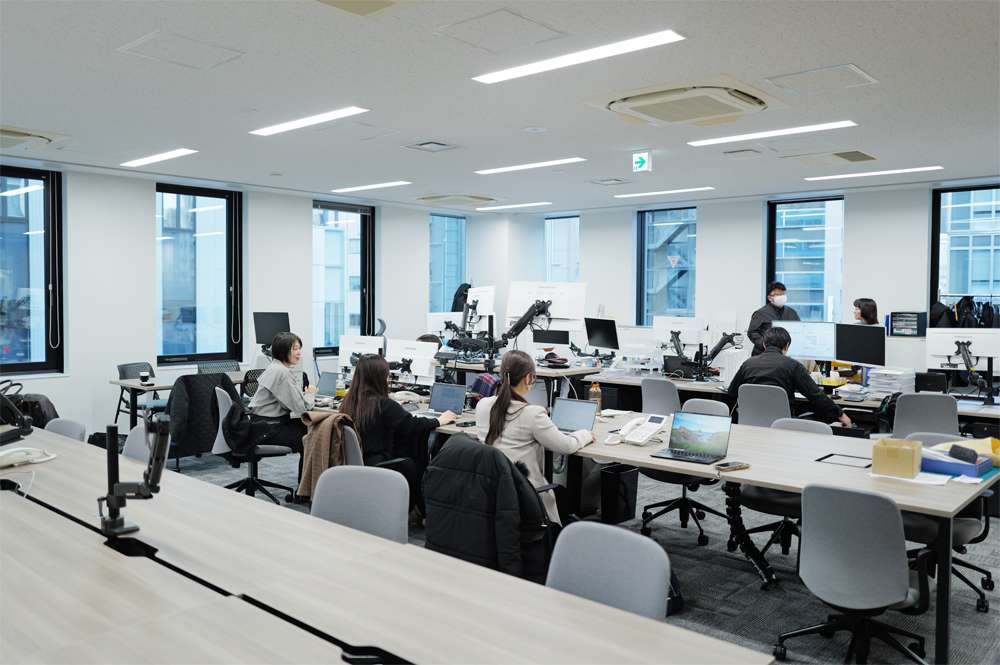 室内は社員がのびのびと働けるよう、シンプルで明るい空間に整えています。2面採光で自然光が入るワークスペースは、気持ちよく仕事に向き合える環境です。
