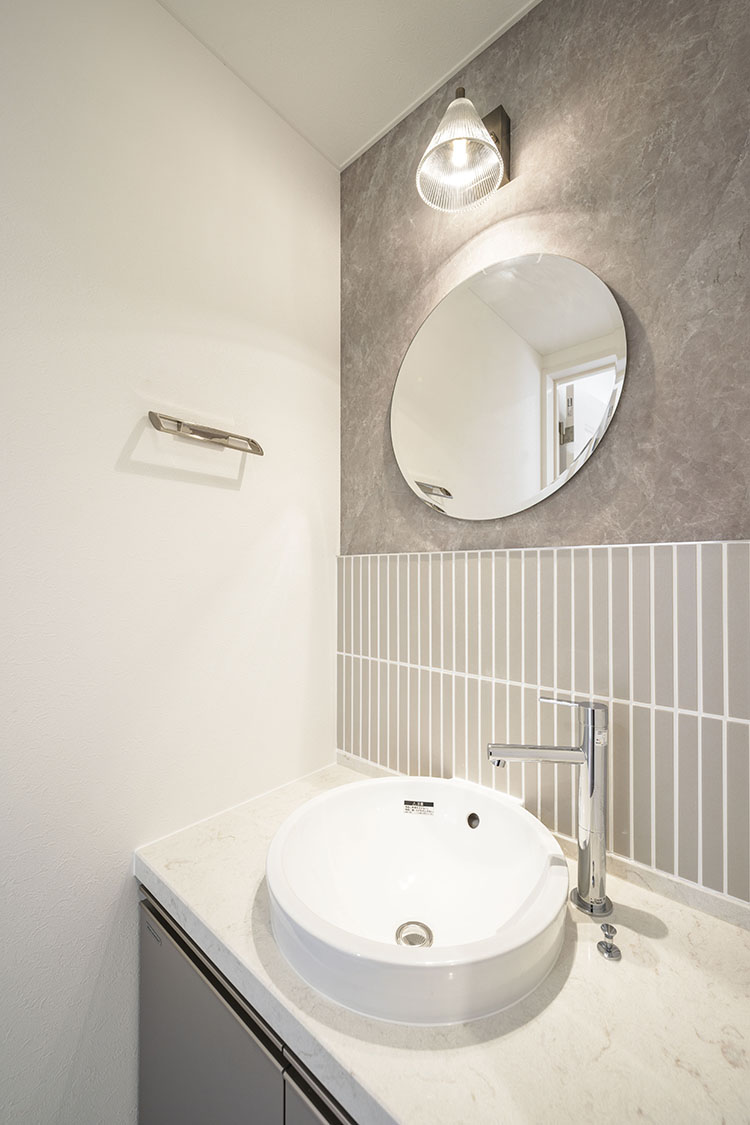 洗面化粧台はご夫婦で並んで使えるワイドタイプを採用し、パウダールームとエントランスにも洗面台を設けることで、家族が順番を待つことなく、スムーズな身支度が叶います。