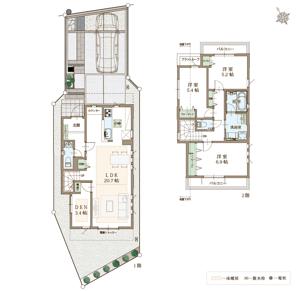 リビングダイニングに加え一部居室に、ガス温水式床暖房を標準装備。高効率給湯器(エコジョーズ)採用でランニングコストも経済的。