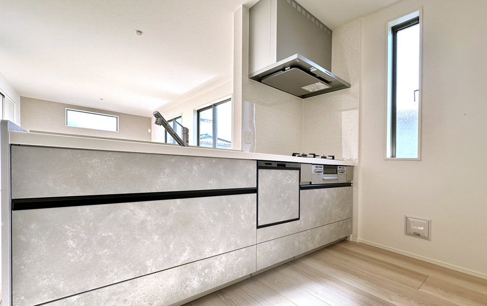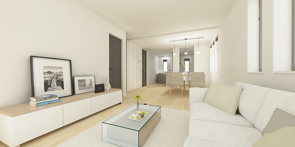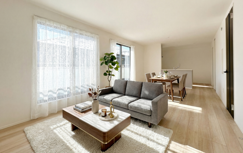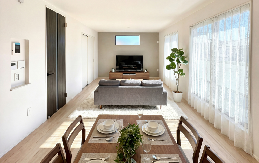 敷地の広さを活かし、20帖超LDKや各居室のゆとり、庭とのつながりなど、開放感ある暮らしを実現。外からの視線を抑えつつ、明るさや風通しにも配慮した配棟計画で、快適な毎日を支えます。