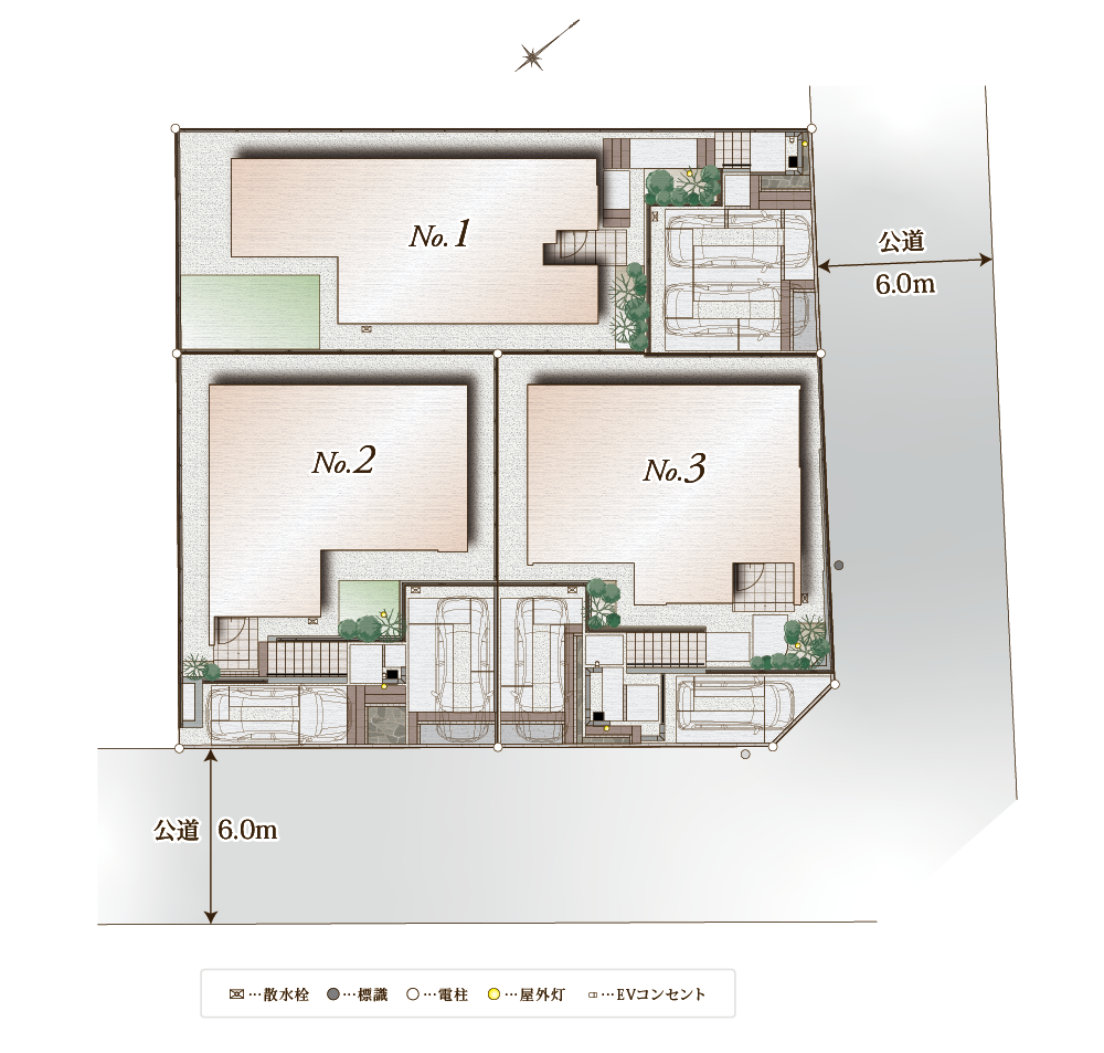 北東側幅員6.00m アスファルト舗装 公道(1・3号棟) |