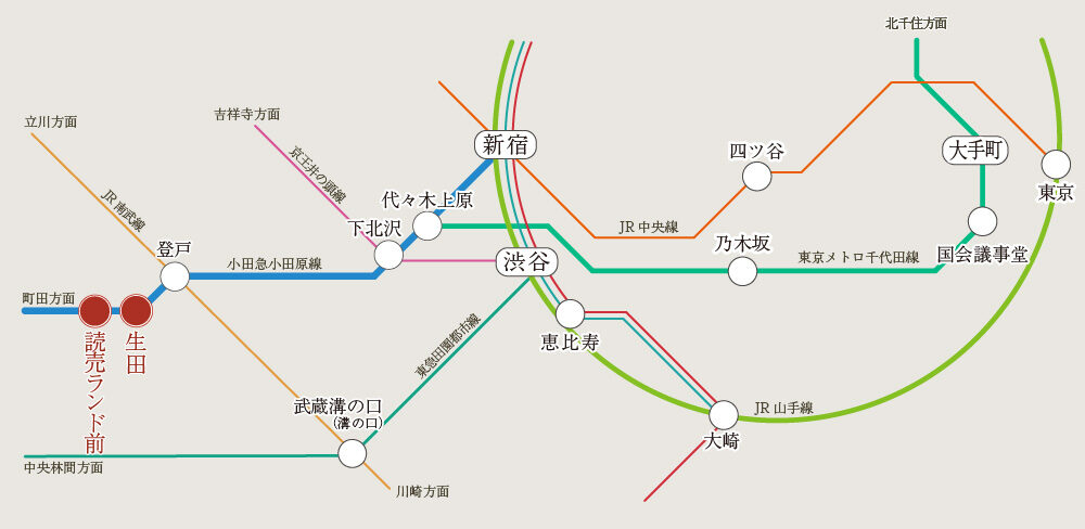 ※掲載の所要時間は平日・通勤時(7:30~9:00)のもので、乗り換え・待ち時間を含みます。また、平常時(11:00~14:00)は異なります。(2025年9月現在)