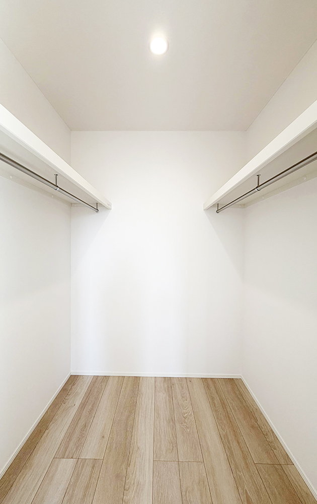 大型のウォークインクローゼットを設計。大量のお洋服が収納可能なので、衣替えいらずでご家族のお洋服を収納できます。