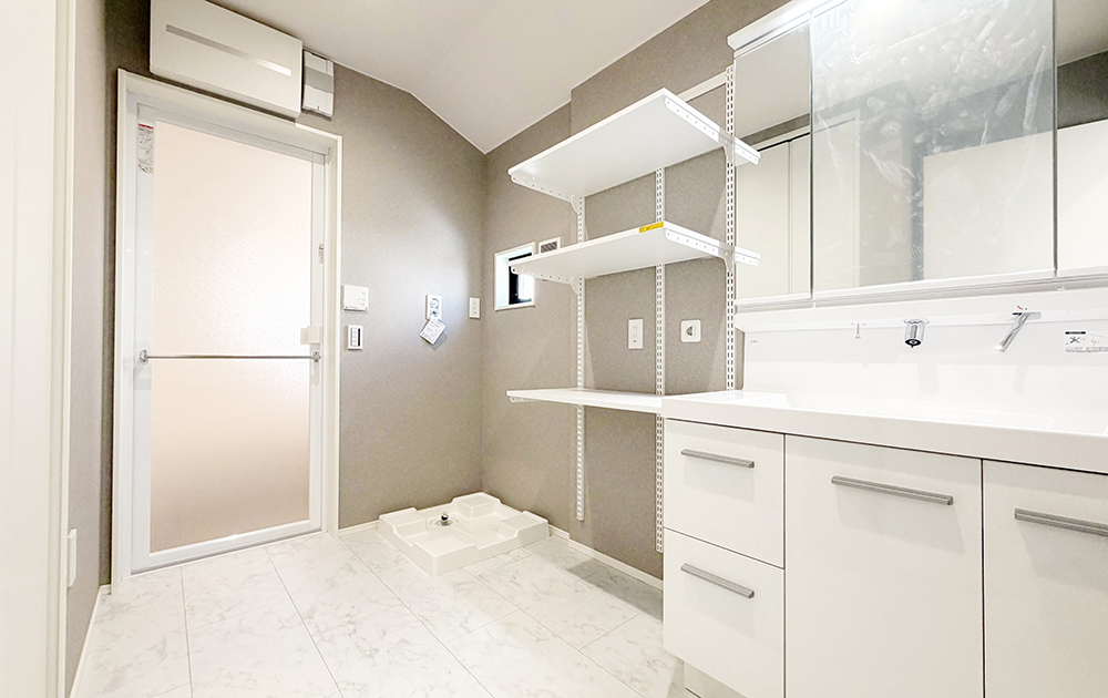 広々とした洗面室は、家族で同時に使えて動きやすく、収納もたっぷり確保できます。