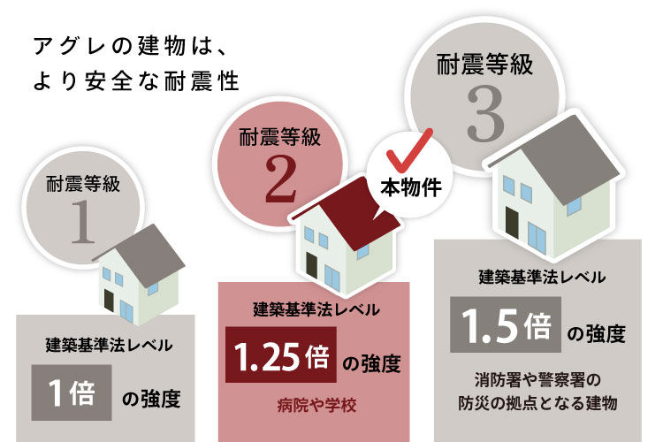 現行の建築基準法では、木造2階建てまでの住宅には高度な『構造計算』が義務付けられておりません。しかし、アグレシオでは、鉄筋コンクリート造など大型建築物と同じように、全棟で構造計算を実施し、「耐震等級2以上」の耐震構造を実現しております。