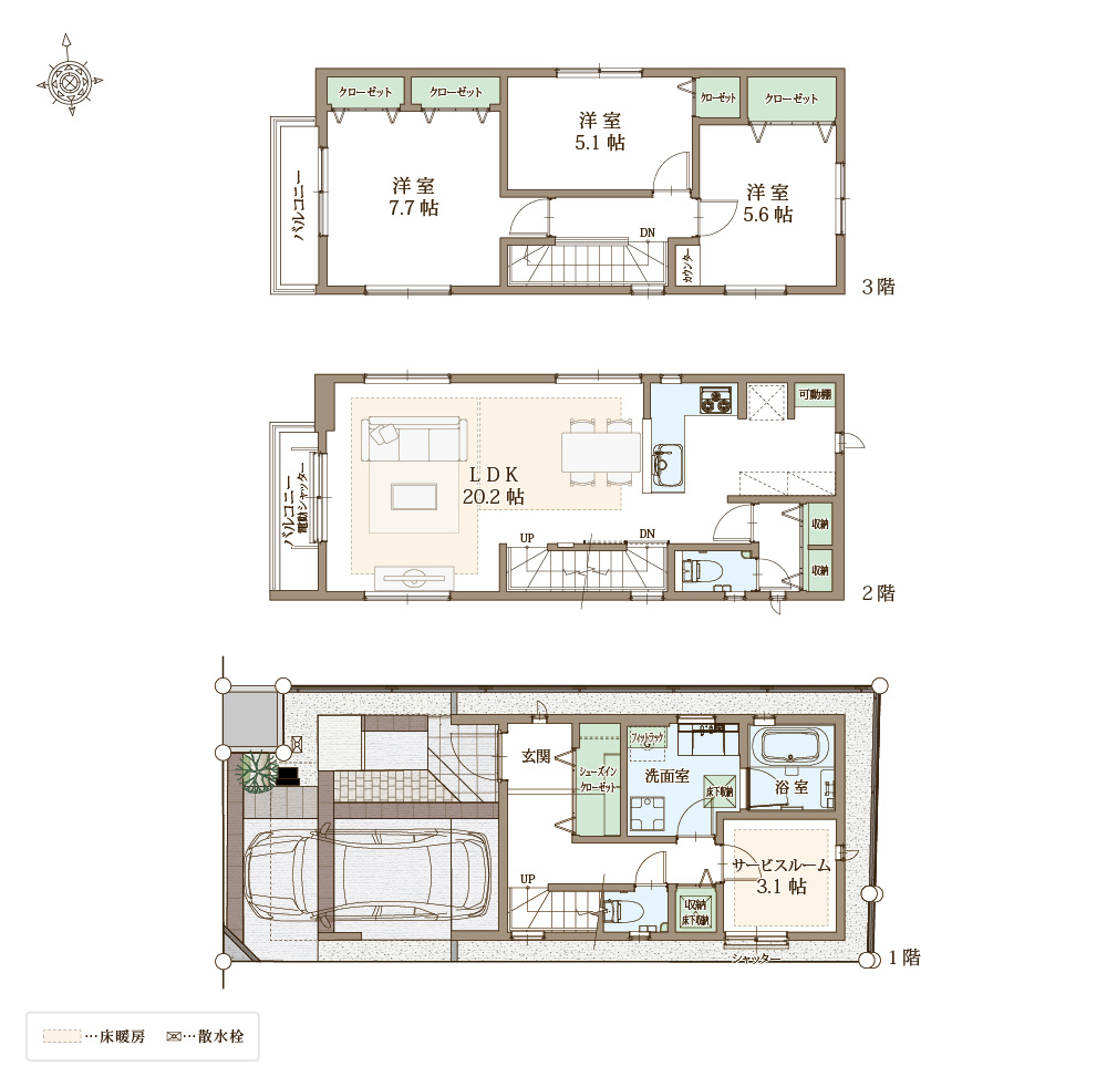 全棟に『防犯カメラ』×『防犯合わせガラス』×『ファミロック』×『人感センサー付きポーチ灯』搭載。先進のIoTを駆使しスマートフォンで管理、街区全体を「見える化」し、不審者の室内への進入をシャットアウト、先進のセキュリティ設備が充実。お子様の留守番、旅行、就寝の際も安心できる住宅仕様です。