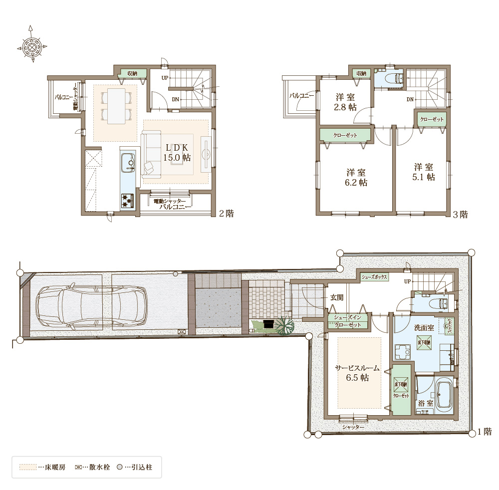 リビングダイニングに加え一部居室に、ガス温水式床暖房を標準装備。高効率給湯器(エコジョーズ)採用でランニングコストも経済的。
