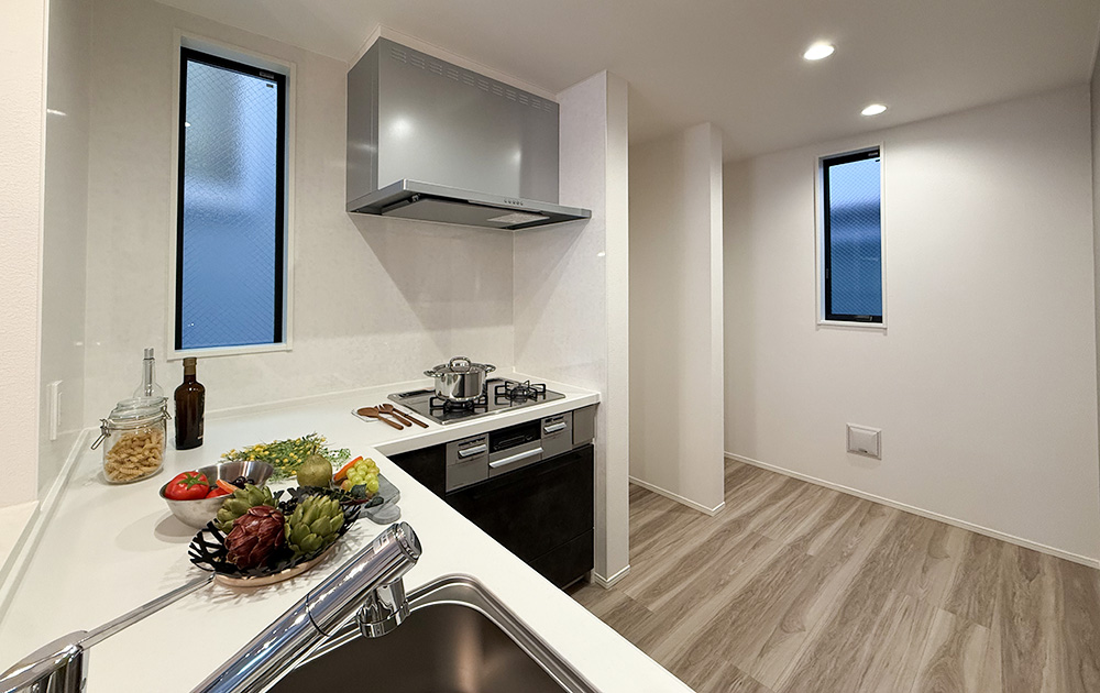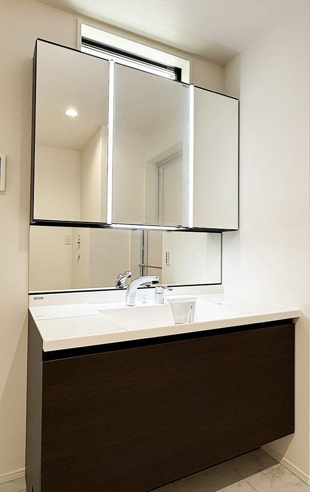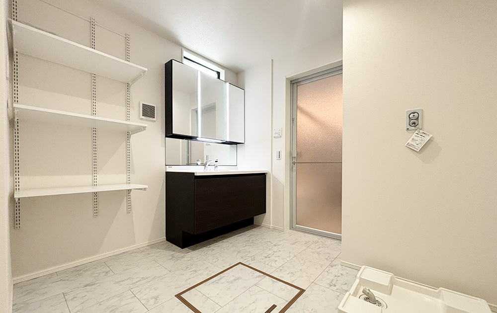 広々とした洗面室は、家族で同時に使えて動きやすく、収納もたっぷり確保できます。子育てや介護にも便利で、掃除もしやすく、いつでも清潔に保てるのが魅力です。