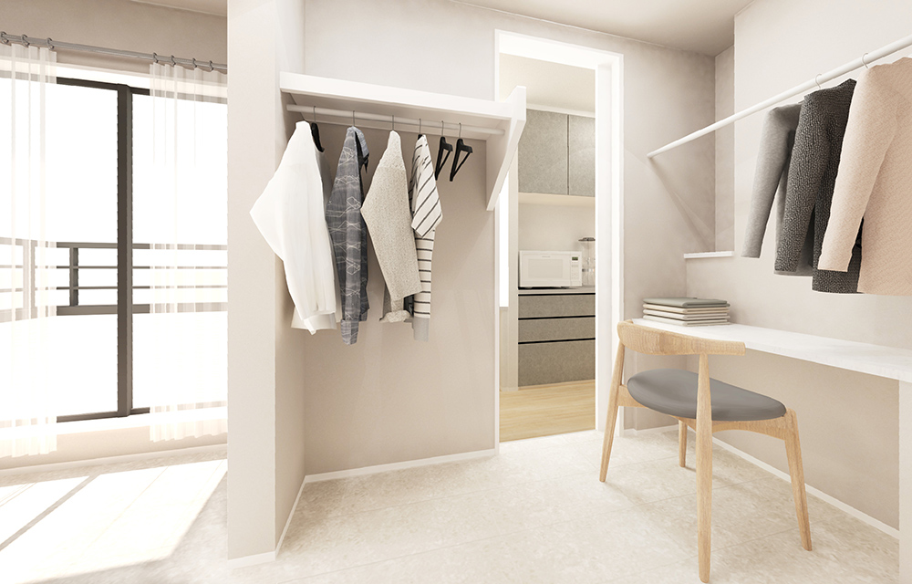 大型のウォークイン/ファミリークローゼットを設計。大量のお洋服が収納可能なので、衣替えいらずでご家族のお洋服を収納できます。