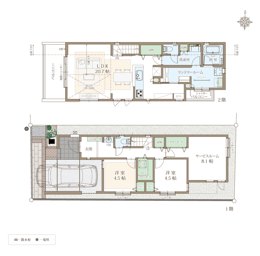 快適性と省エネ性に優れた太陽光パネル×蓄電池の次世代型省エネ住宅。自立する住宅を目指し、災害時でも安心。ZEH水準省エネ住宅に該当。電動シャッターや防犯ガラスを合わせたペアガラスでセキュリティも万全。