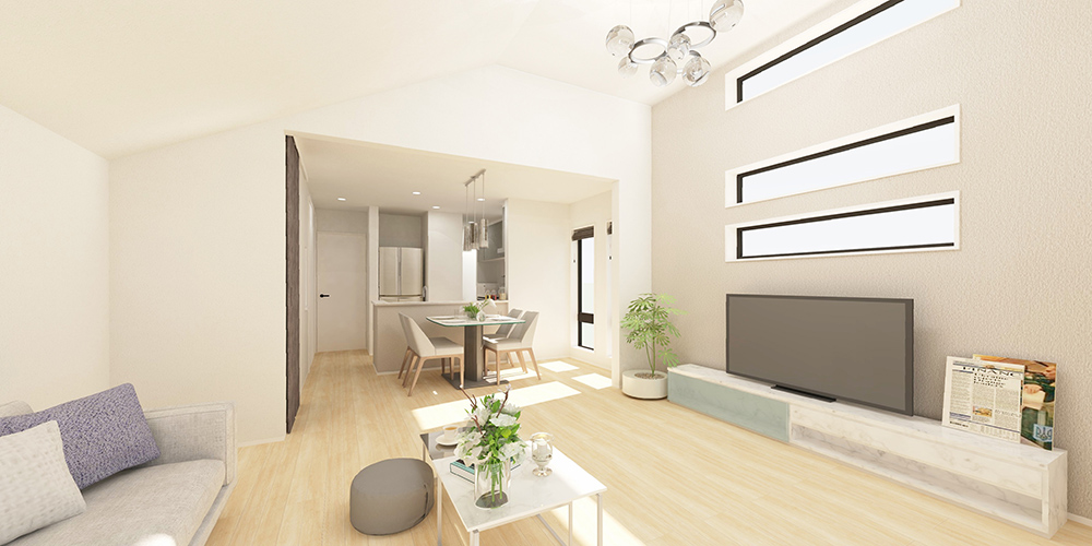 視線が気にならない、高いプライバシー性を誇る2階LDKプラン。差し込む明るい陽光が、家族団らんの空間を満たします。