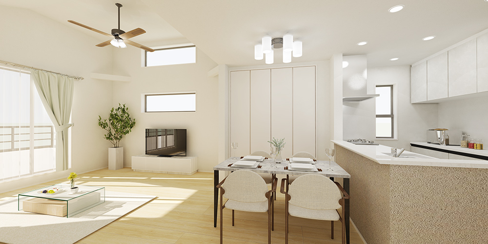 視線が気にならない、高いプライバシー性を誇る都心の2階LDKプラン。差し込む明るい陽光が、家族団らんの空間を満たします。