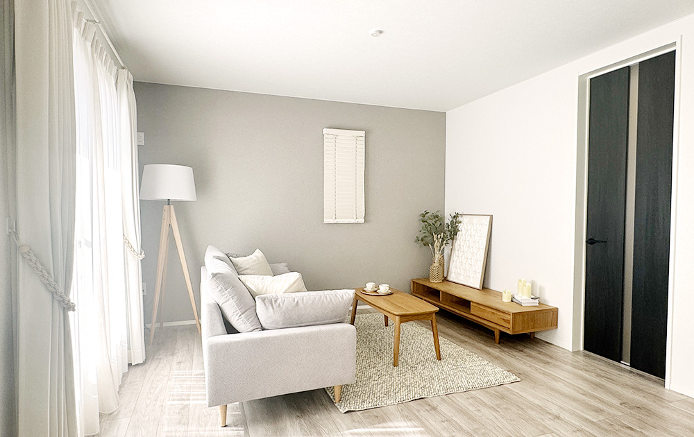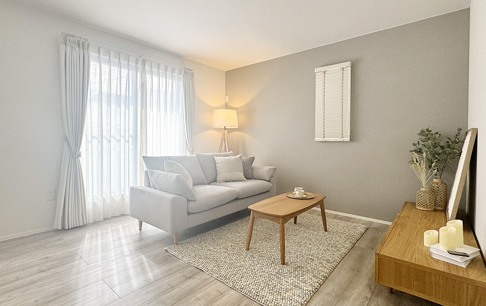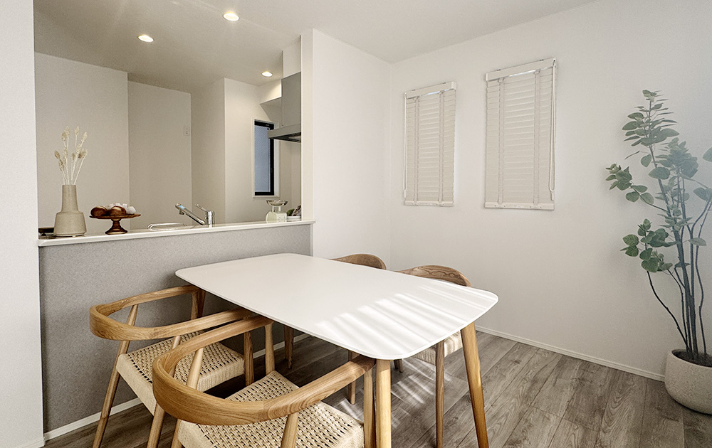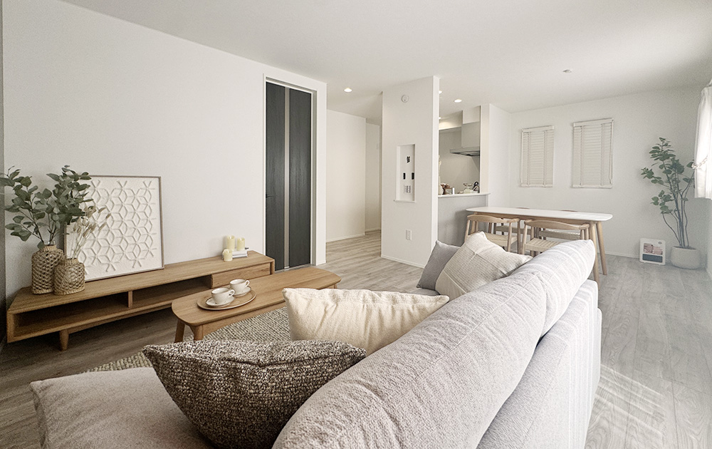 広さと採光に特化した室内空間が特徴的。差し込む明るい陽光と吹き抜ける風が、家族団らんの空間を満たします。
