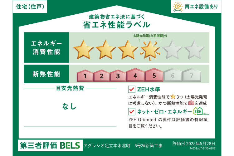 本物件はBELS評価を取得しております。BELSとはその住宅のエネルギー消費性能や断熱性能を評価・表示する 制度であり、第三者機関の審査を受けた後に評価書等が交付されます。