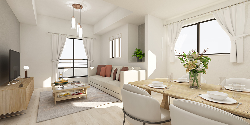 伸びやかな高天井が生み出す開放感あふれるリビング。広々とした空間に満ちる光とゆとりが、家族の時間をより豊かに育みます。