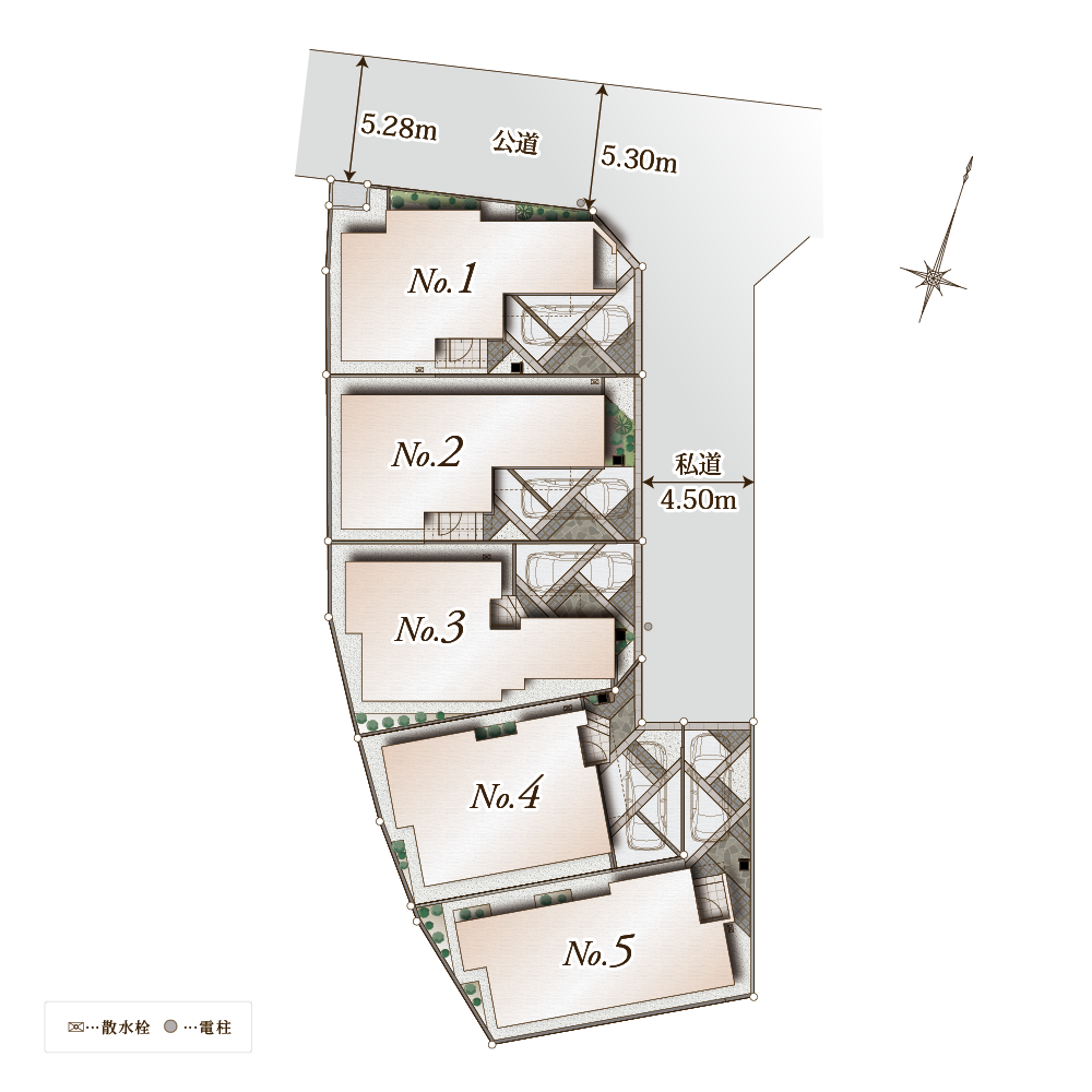 北側幅員5.28~5.30m アスファルト舗装 公道(1号棟)