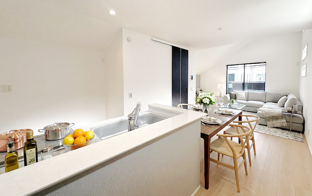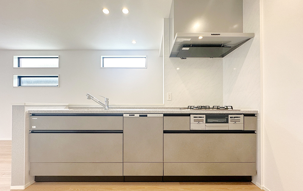 キッチンは、美しさと耐久性を兼ね備えたアクリル人造大理石のワークトップ。頑丈で熱に強く、水拭きでサッと拭くだけでキレイが長持ちします。