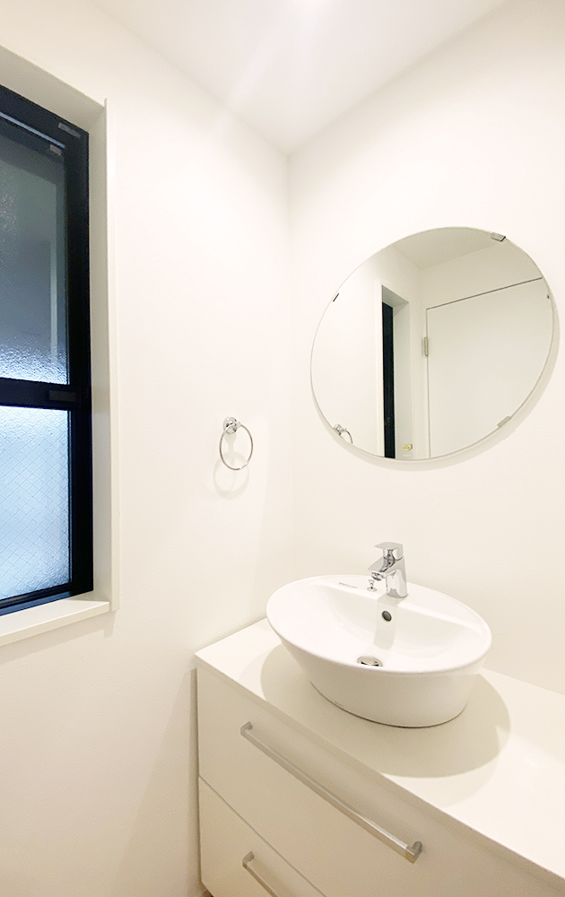来客の際にも手洗いや身だしなみを整える空間として快適にお使いいただけるようタオル掛けや鏡も設置しています。