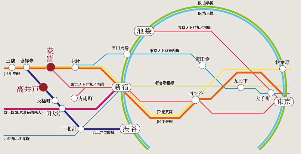 ※掲載の所要時間は平日・通勤時(7:30~9:00)のもので、乗り換え・待ち時間を含みます。また、平常時(11:00~14:00)は異なります。(2026年3月現在)