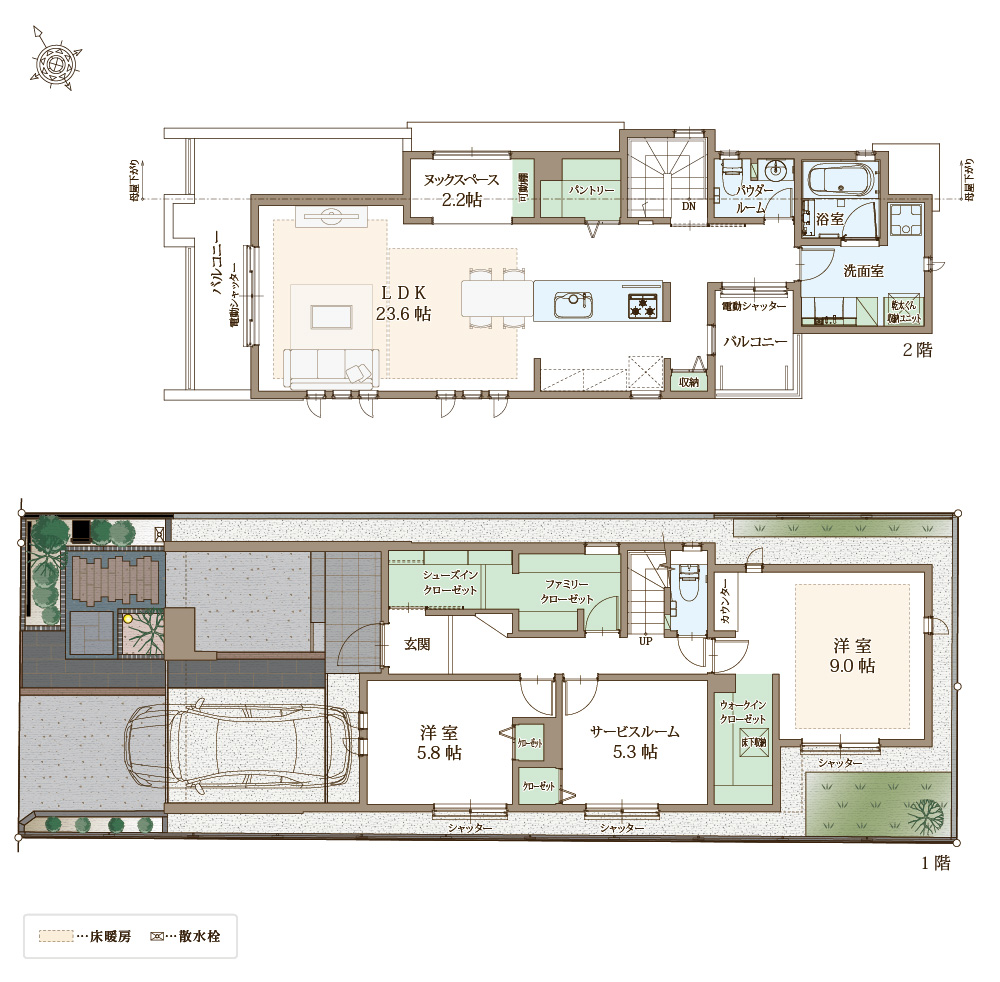 快適性と省エネ性に優れた太陽光パネル×蓄電池の次世代型省エネ住宅。自立する住宅を目指し、災害時でも安心。ZEH水準省エネ住宅に該当。電動シャッターや防犯ガラスを合わせたペアガラスでセキュリティも万全。