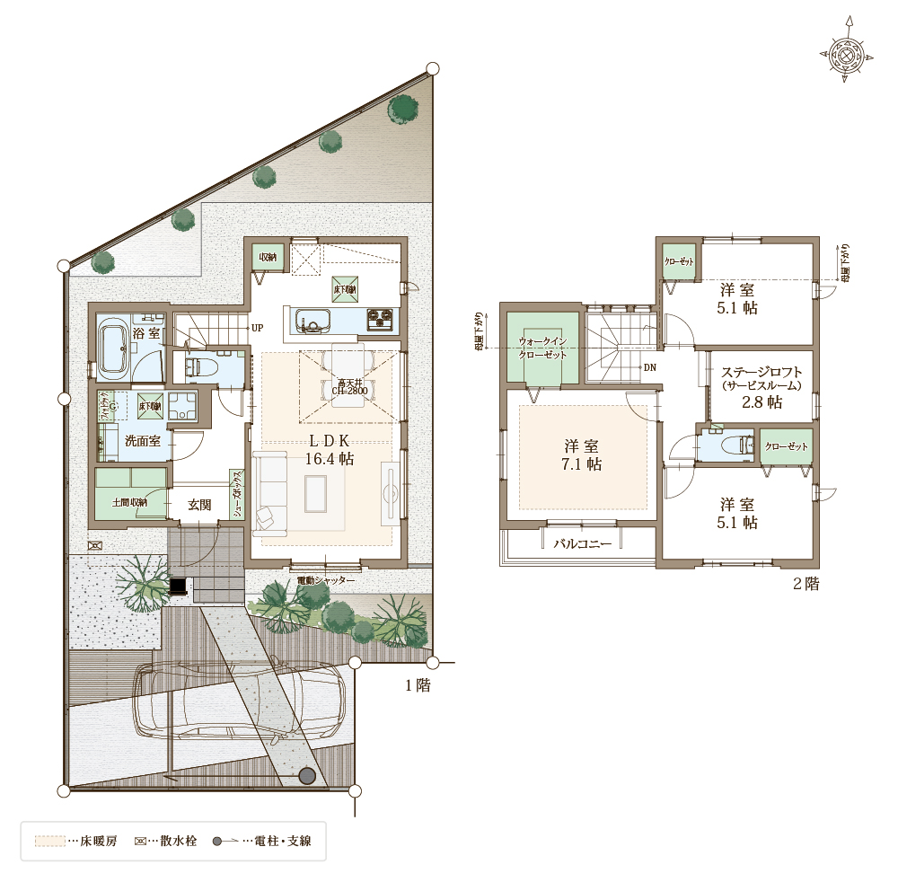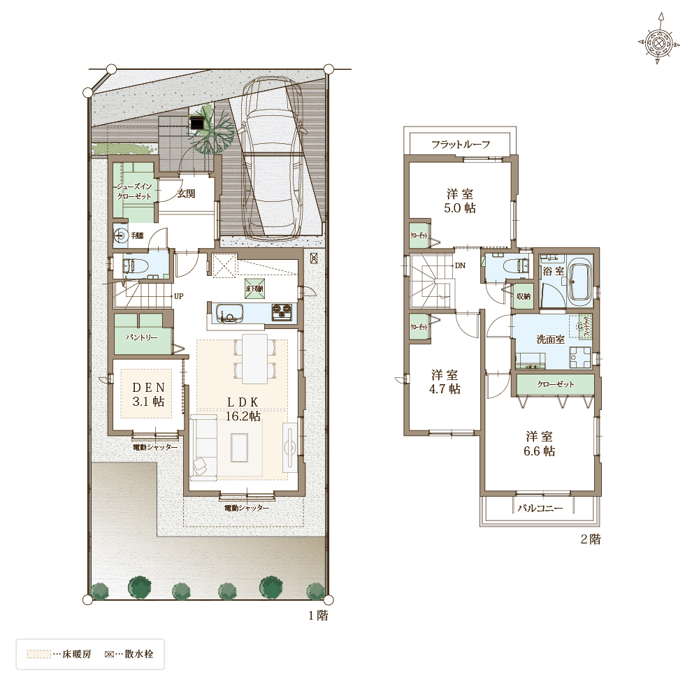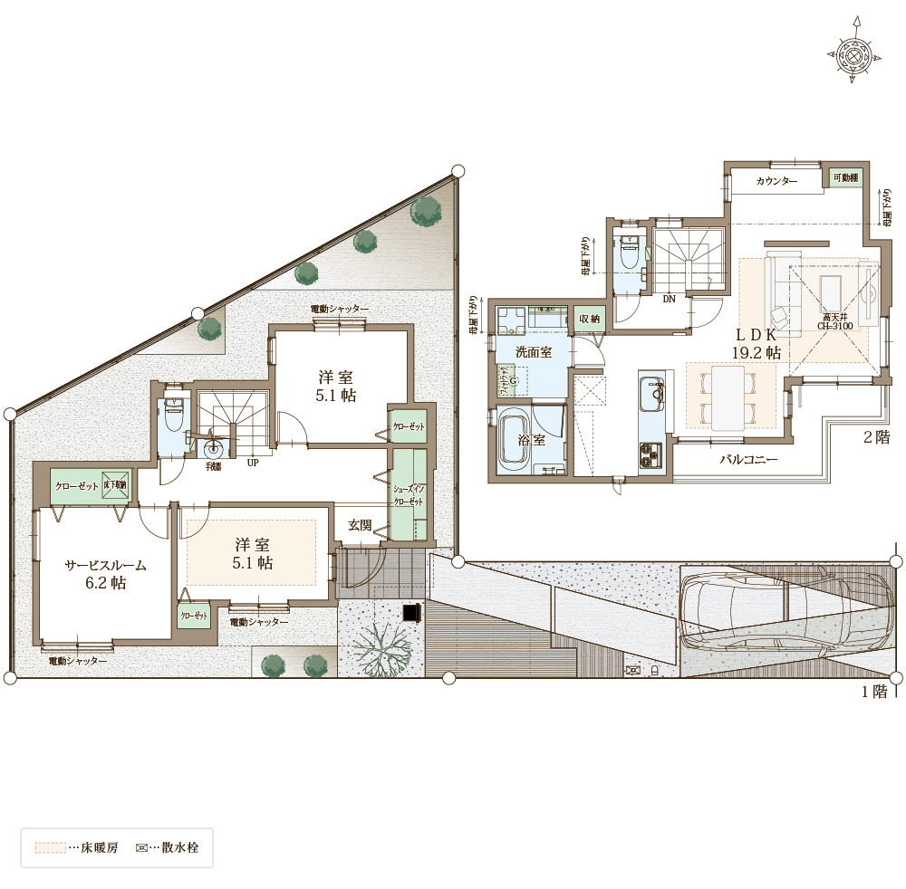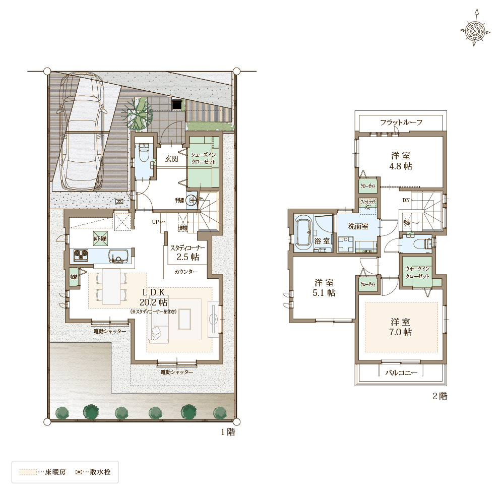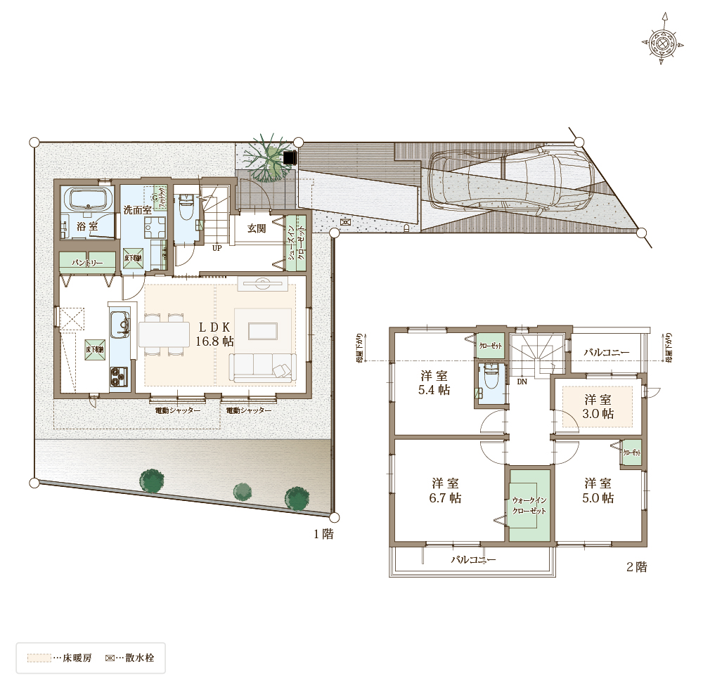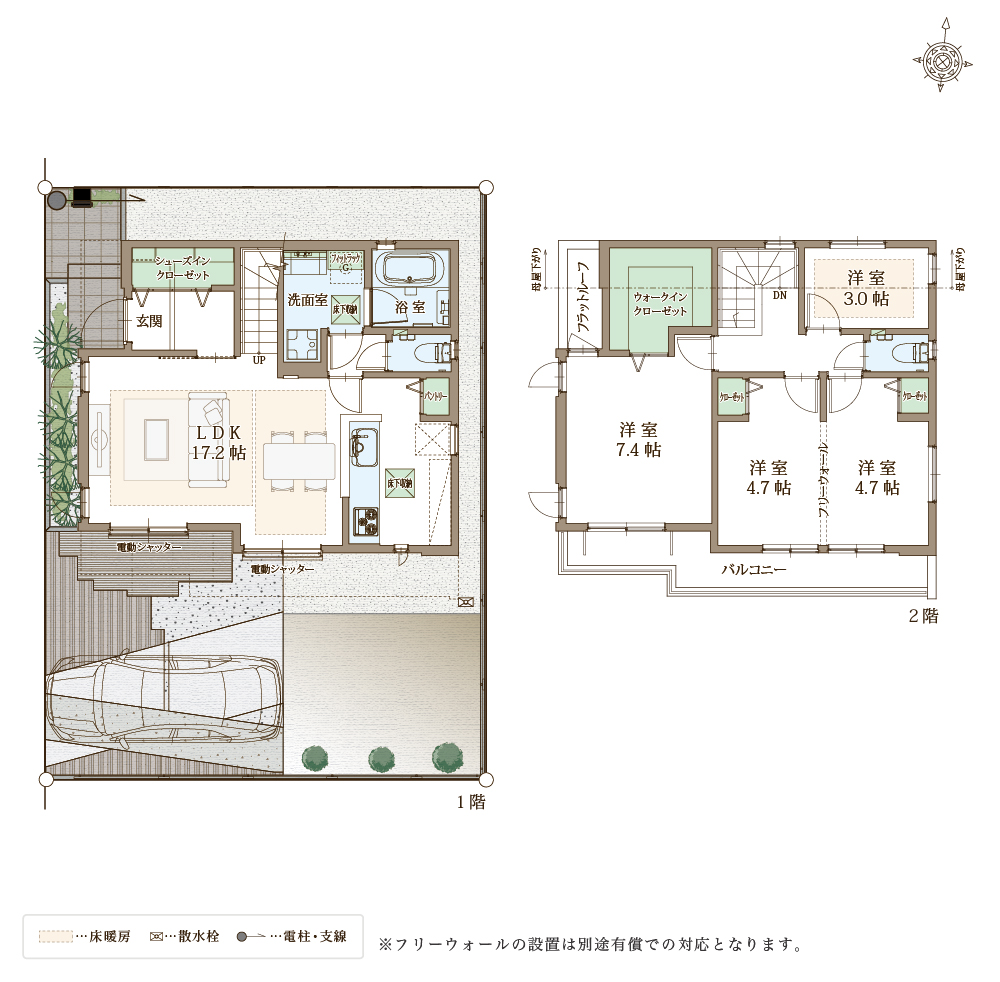 快適性と省エネ性に優れた太陽光パネル×蓄電池の次世代型省エネ住宅。自立する住宅を目指し、災害時でも安心。ZEH水準省エネ住宅に該当。電動シャッターや防犯ガラスを合わせたペアガラスでセキュリティも万全。