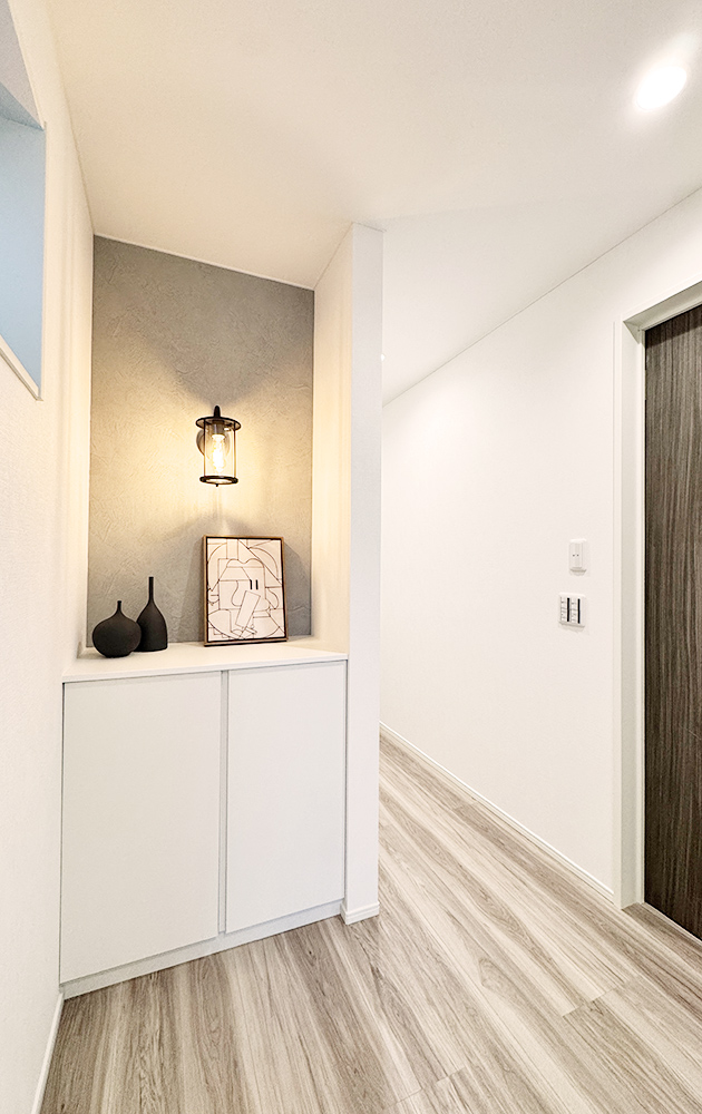 人が近づくと自動で点灯する玄関ホール照明を採用。帰宅時スイッチに触れずに点灯できるため、感染症対策にも有効です。